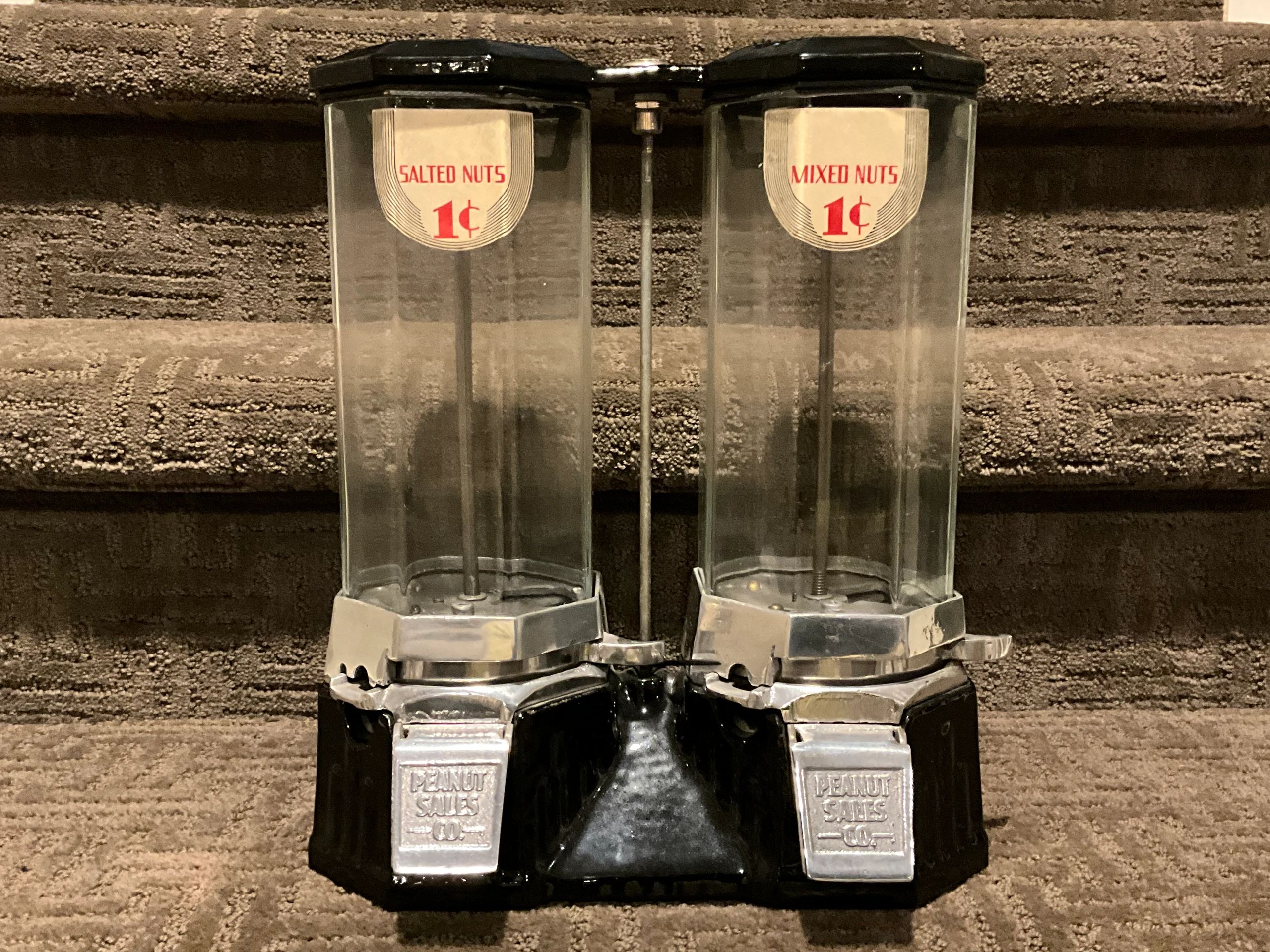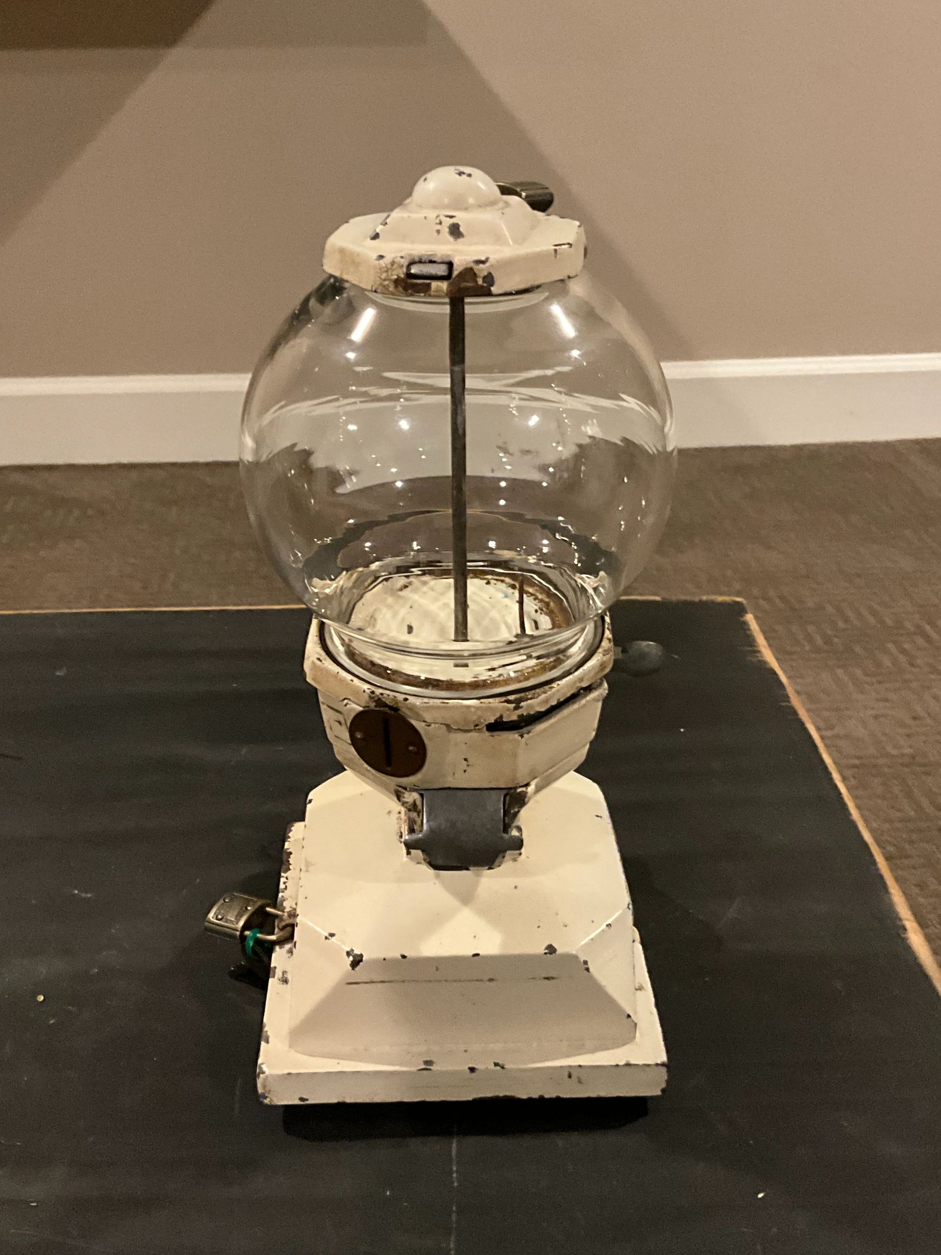 The Columbus Model E breath pellet machine is a cast iron machine which vended breath pellets for a penny. This version has a tray and the version below does not. Both are very very hard to find but the tray is much harder. I was fortunate and purchased these both out the same collection. These are all original.
